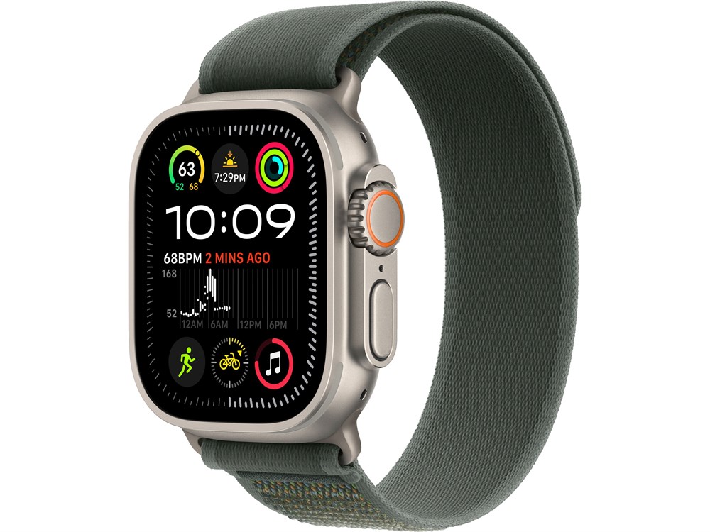 Watch Ultra 2, 49 мм, Натуральный Титан корпус c Green Trail Loop ремешком — M/L (145-220 мм)